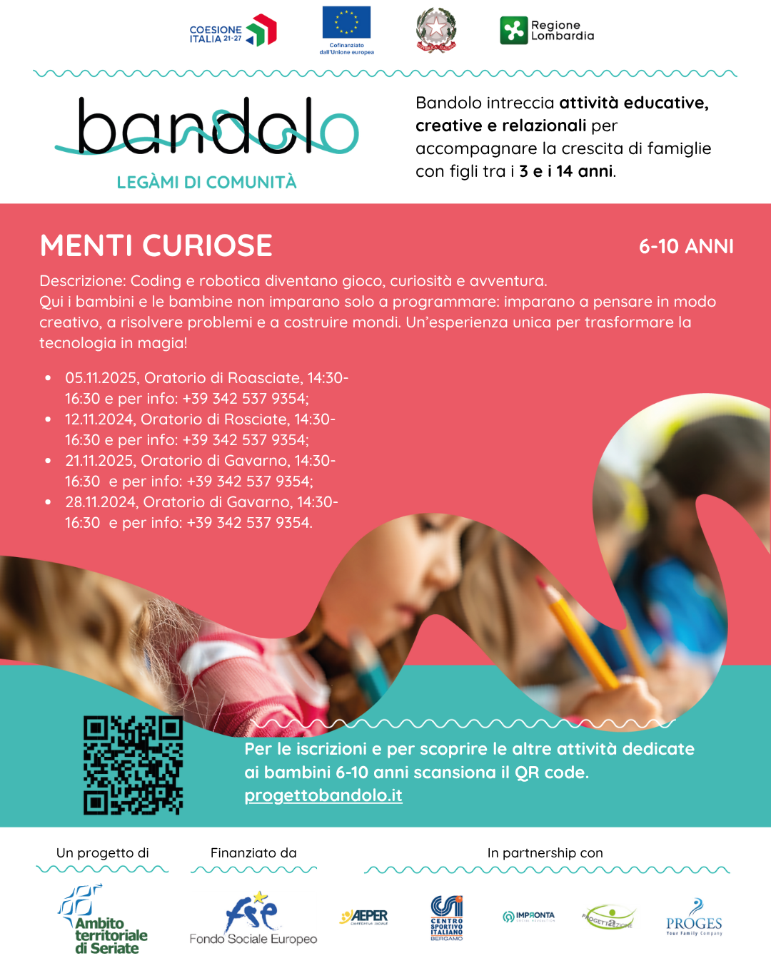 Una proposta gratuita di coding e robotica denominata “MENTI CURIOSE” rivolta ai bambini tra 6 e 10 anni, all’interno del Progetto Bandolo si svolgerà nei giorni del 5 e 12 novembre all'oratorio di Rosciate, e del 21 e 28 novembre all’oratorio di Trbulina-Gavarno.